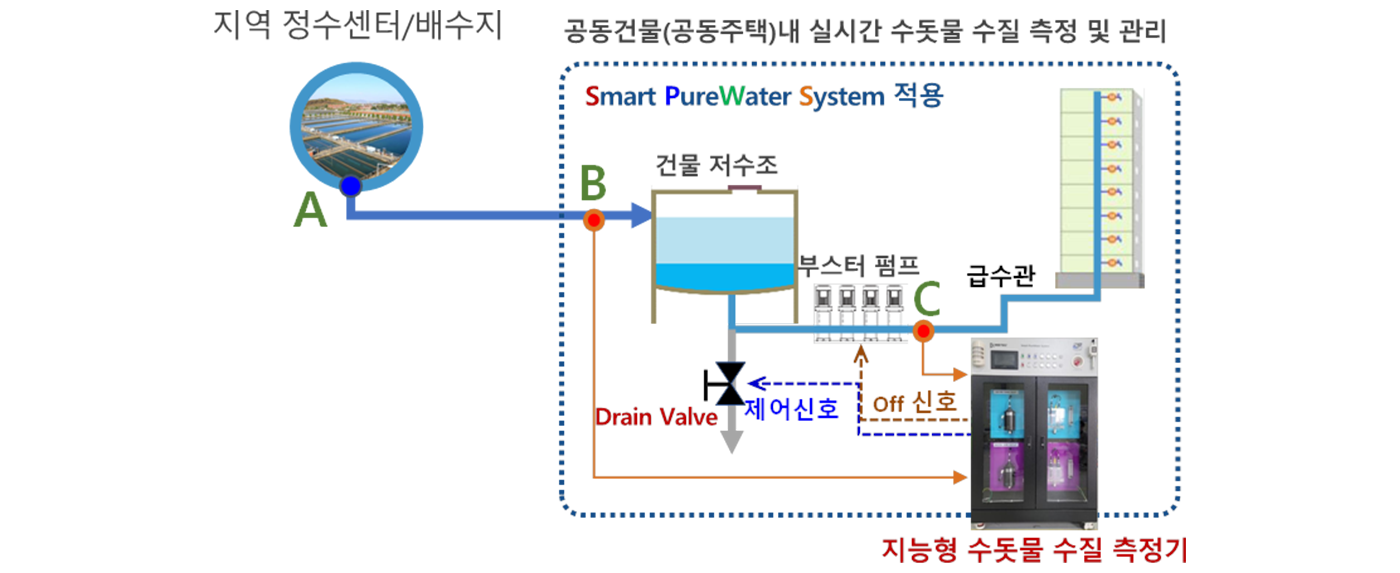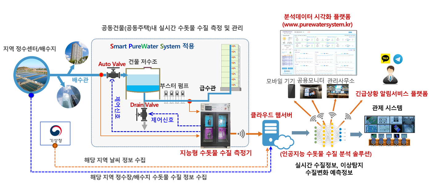 Smart PureWater System은 공동건물 또는 공동주택 내부의 각 위치에서 수돗물의 수질 상태를 실시간 측정하고, 측정된 Data는 무선 인터넷망을 통해 클라우드 웹서버로 전송되며, 웹서버에서는 각 위치 별 실시간 수질 상태 정보와 인공지능 수질분석 솔루션에 의해 분석된 수질 및 배수관, 저수조, 급수관의 이상탐지 및 오염 예측정보를 제공함으로써 사용자에게는 수돗물에 대한 신뢰도 향상과 관리자에게는 각 구간별 배관 및 저수조의 오염상태 정보를 제공하는 스마트 시스템이다.